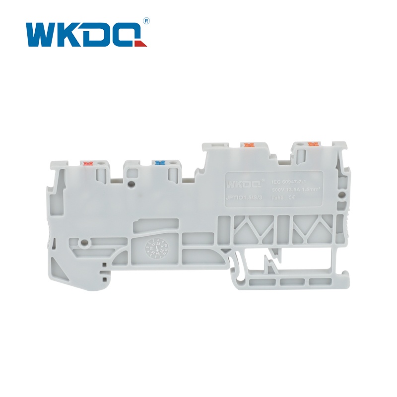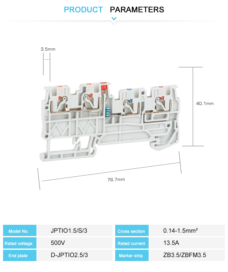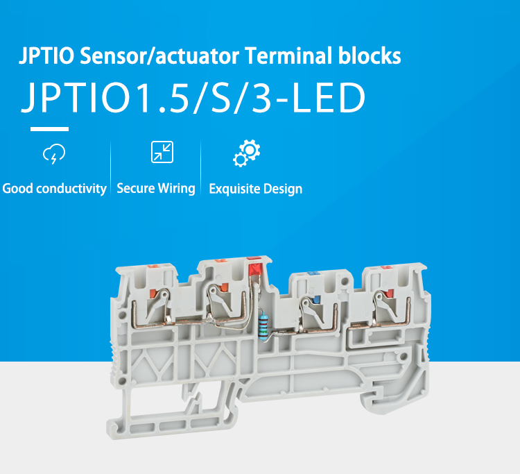 Khối đầu cuối JPTIO1.5/S/3-LED(24V) Khối đầu cuối sử dụng nylon PA66 chống cháy, dây dẫn bằng đồng và lò xo nén bằng thép không gỉ để đảm bảo an toàn điện và độ bền cơ học trong điều kiện làm việc khắc nghiệt.